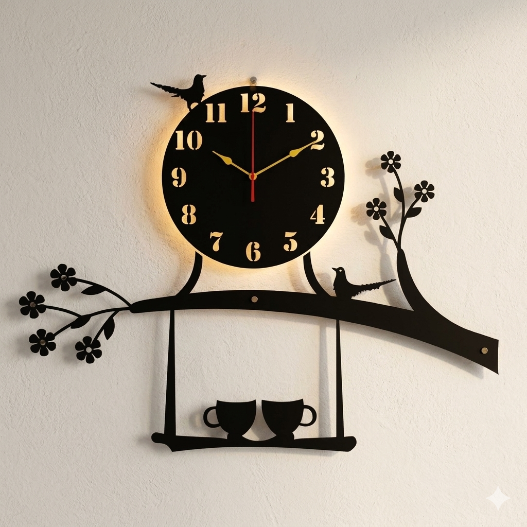 Bring natural beauty and modern style to your space with this Laminated Wall Clock featuring a stylish bird and floral design with built-in backlight. Perfect for living rooms, bedrooms, offices, or any wall that needs a decorative upgrade, this clock creates a warm and elegant ambiance. The laser-cut pattern combined with soft lighting makes it a standout piece for contemporary Pakistani homes.
